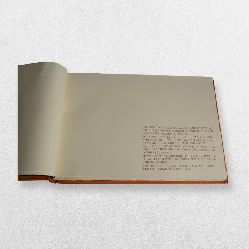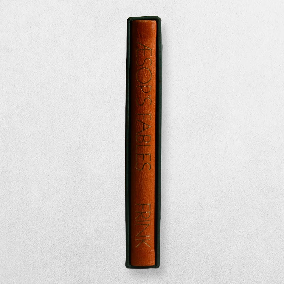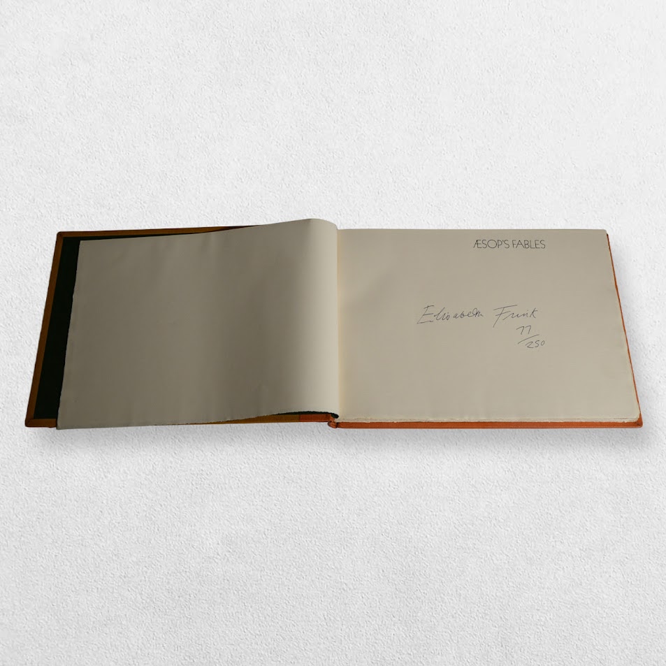 Designed and printed at The Curwen Press. Edition number 77/250 copies marked ‘A7’ in pencil to the front free endpaper. Bound by Mansell, London in specially prepared leathers in original cloth slipcase. A magnificent production featuring finely-printed renderings of the fables by Elisabeth Frink in colour and black and white and using the text from John Murray’s edition of 1897. Includes four original lithographs bound in at the rear all of which are signed in pencil by Elisabeth Frink. It is often the case with this edition that the original lithographs are left unsigned. This is a lovely fine, tight, bright, clean copy with only the tiniest amount of shelf wear in a very near fine, very slightly rubbed slipcase. Scarce thus.