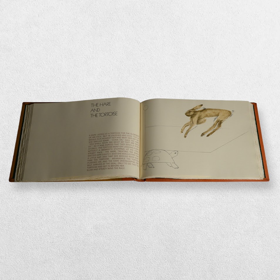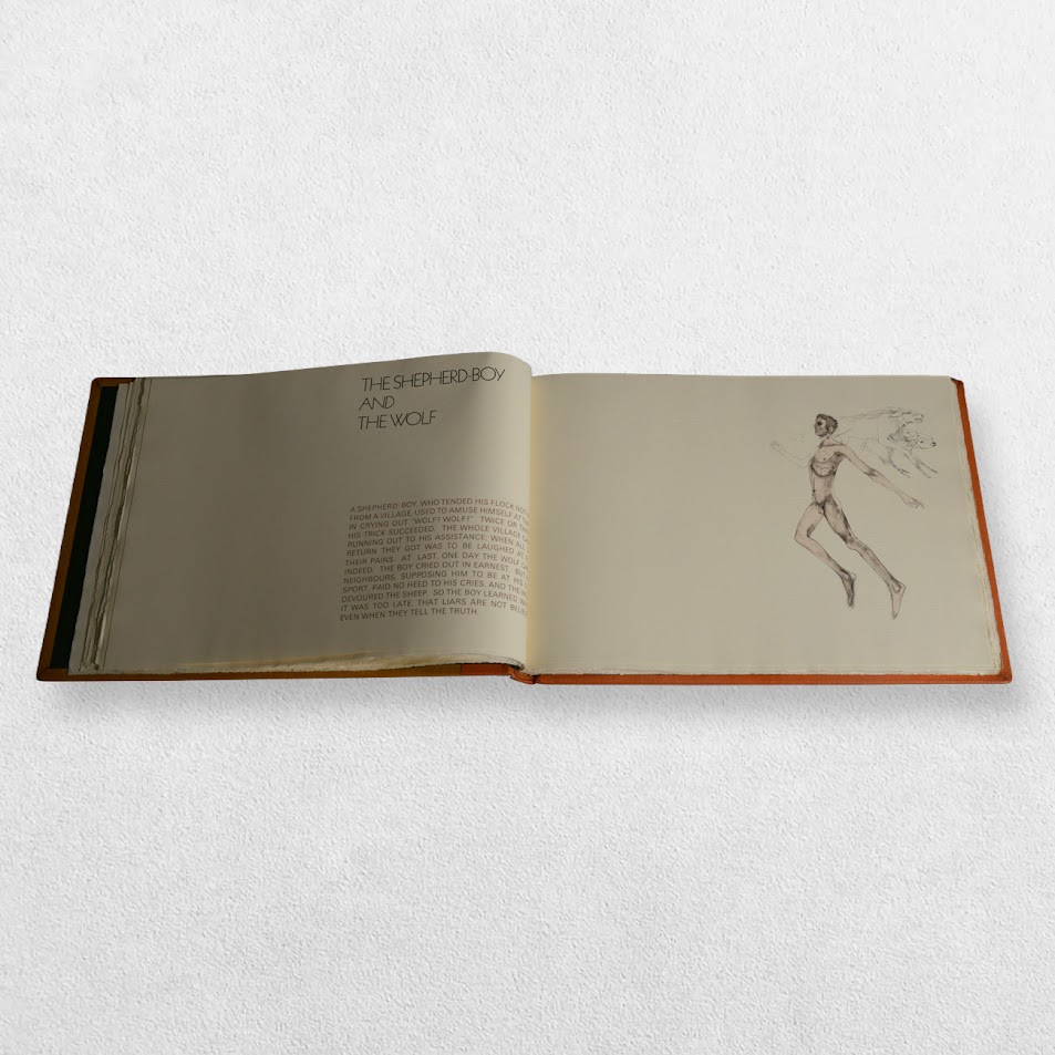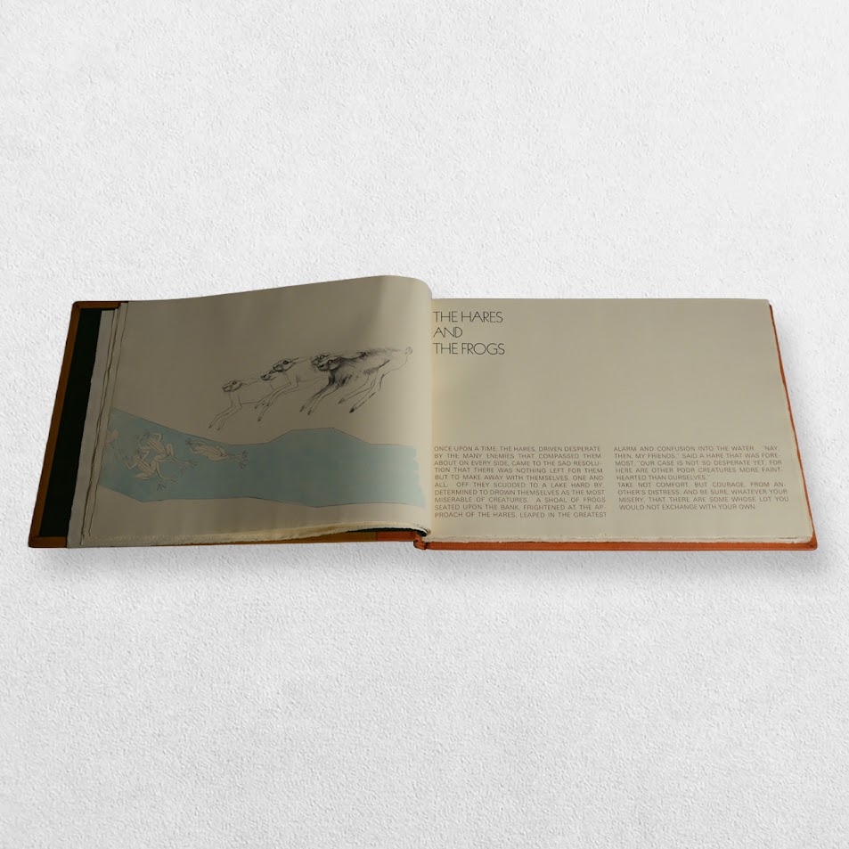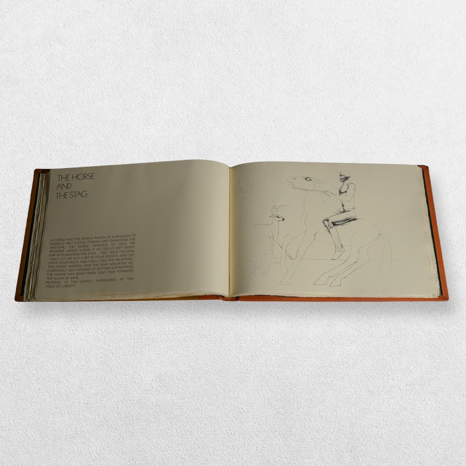 Designed and printed at The Curwen Press. Edition number 77/250 copies marked ‘A7’ in pencil to the front free endpaper. Bound by Mansell, London in specially prepared leathers in original cloth slipcase. A magnificent production featuring finely-printed renderings of the fables by Elisabeth Frink in colour and black and white and using the text from John Murray’s edition of 1897. Includes four original lithographs bound in at the rear all of which are signed in pencil by Elisabeth Frink. It is often the case with this edition that the original lithographs are left unsigned. This is a lovely fine, tight, bright, clean copy with only the tiniest amount of shelf wear in a very near fine, very slightly rubbed slipcase. Scarce thus.