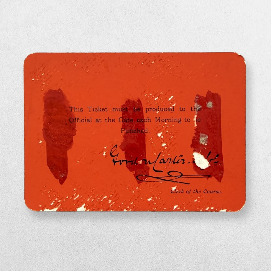 A visually striking and historically informative survival, this ticket encapsulates the layered access structures of Ascot in the Edwardian period. Its association with the Four-in-Hand Club situates it within a network of elite sporting sociability, while the signed authorisation of the Clerk of the Course underscores the formal mechanisms by which such privilege was regulated. Together, these features offer a well-substantiated and credible insight into the administration, hierarchy, and lived experience of Royal Ascot immediately prior to the First World War.