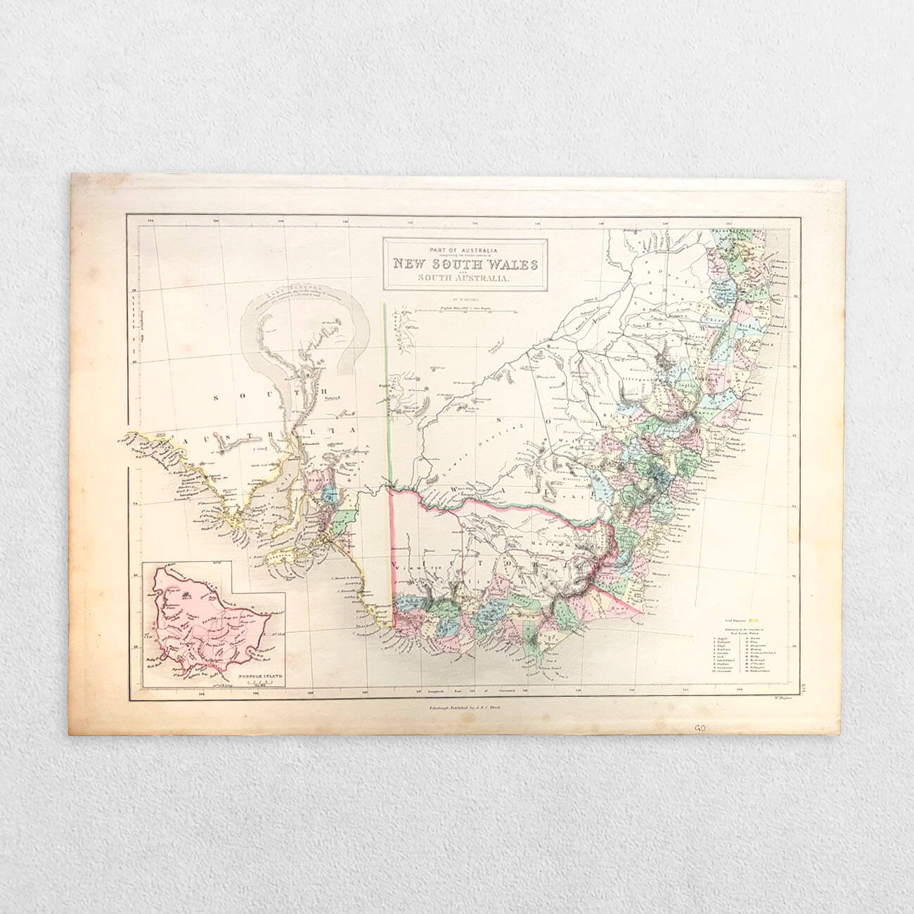 Date: 1844. Original steel engraving. Sheet size: 43.6cm x 31.3cm. From Black’s General Atlas. Inset map of Norfolk Island. Shows Victoria as part of New South Wales as it did not become a separate state until 1851. Blank to the reverse. Contemporary outline hand-colouring. Minor age toning which is mainly confined to the margins. A very good indeed, bright, clean copy.