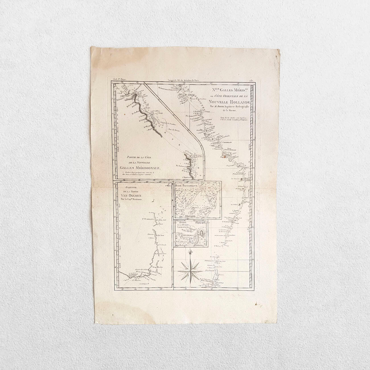 Bonne, Rigobert: Date: 1787. Original copper engraving. Sheet size: 30.7cm x 45.6cm. Based on the explorations of Cook and Furneaux. Also includes inset maps of Botany Bay and the entrance to Endeavour River. Blank to the reverse. Central fold line. Minor age toning which is mainly confined to the margins with a very small amount of loss. A very good, bright, clean copy. Sleeve 1111: Map Drawer D.