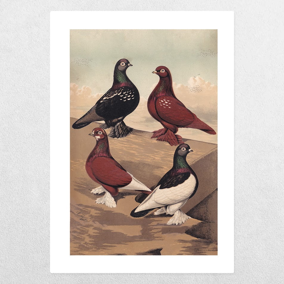 “Flying Tumbler Pigeon” by J. W. Ludlow showcases the exceptional chromolithographic technique of the 19th century, renowned for its rich colours and intricate details. Ludlow was a distinguished artist known for his exquisite bird illustrations, capturing the elegance and beauty of avian species with remarkable accuracy.