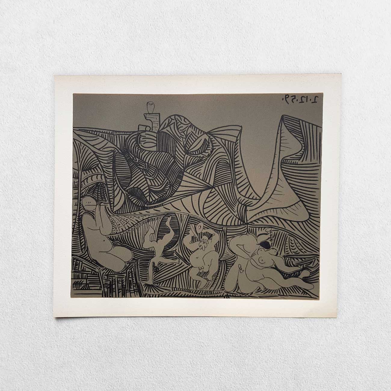 Publisher: Editions Cercle D’Art, Paris, France. Date: 1962. First edition. Printed in Germany. Linocut size: H: 26.8cm W: 32.4cm. Sheet size: H: 31.7cm W: 37.4cm. Original linocut after and approved by Picasso for ‘Picasso Linogravures”, 1962. These linocuts were first issued in signed editions of fifty by Galerie Louise Leiris and printed by Arnéra. Because of the “reduction” method invented and used by Picasso, which uses just one plate of linoleum instead of a separate one for each colour, it was impossible to make any more prints from the original plates. Therefore, in collaboration with Picasso and Galerie Louise Leiris, new linoleum plates were made at 42% of the original size, and it was from these that the above prints were made. Ref: Bloch 909. (Later editions of this work, the editions of 1988 and 2020, were digitally copied without any impression marks, used lesser quality inks, on inferior paper and greatly reduced in quality.) This is a genuine linocut, dating from 1962 on heavy stock paper. Condition: Strong impression mark. Very faint foxing to the margins else a fine, tight, bright, clean copy. Scarce.