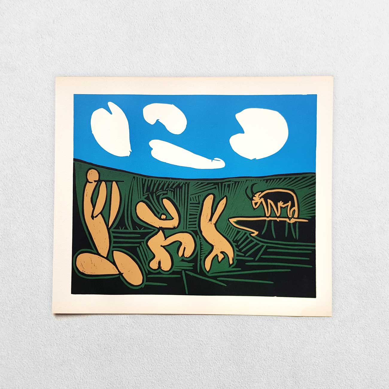 Publisher: Editions Cercle D’Art, Paris, France. Date: 1962. First edition. Printed in Germany. Linocut size: H: 26.8cm W: 32.4cm. Sheet size: H: 31.7cm W: 37.4cm. Original linocut after and approved by Picasso for ‘Picasso Linogravures”, 1962. These linocuts were first issued in signed editions of fifty by Galerie Louise Leiris and printed by Arnéra. Because of the “reduction” method invented and used by Picasso, which uses just one plate of linoleum instead of a separate one for each colour, it was impossible to make any more prints from the original plates. Therefore, in collaboration with Picasso and Galerie Louise Leiris, new linoleum plates were made at 42% of the original size, and it was from these that the above prints were made. Ref: Bloch 909. (Later editions of this work, the editions of 1988 and 2020, were digitally copied without any impression marks, used lesser quality inks, on inferior paper and greatly reduced in quality.) This is a genuine linocut, dating from 1962 on heavy stock paper. Condition: Strong impression mark. Very faint foxing to the margins else a fine, tight, bright, clean copy. Scarce.