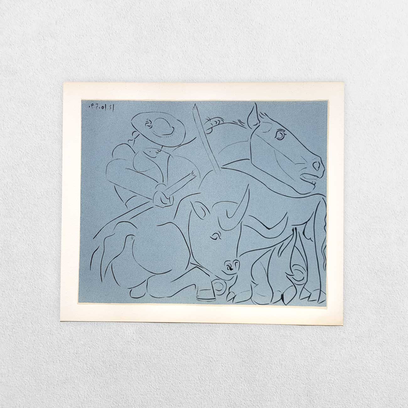 Publisher: Editions Cercle D’Art, Paris, France. Date: 1962. First edition. Printed in Germany. Linocut size: H: 26.8cm W: 32.4cm. Sheet size: H: 31.7cm W: 37.4cm. Original linocut after and approved by Picasso for ‘Picasso Linogravures”, 1962. These linocuts were first issued in signed editions of fifty by Galerie Louise Leiris and printed by Arnéra. Because of the “reduction” method invented and used by Picasso, which uses just one plate of linoleum instead of a separate one for each colour, it was impossible to make any more prints from the original plates. Therefore, in collaboration with Picasso and Galerie Louise Leiris, new linoleum plates were made at 42% of the original size, and it was from these that the above prints were made. Ref: Bloch 909. (Later editions of this work, the editions of 1988 and 2020, were digitally copied without any impression marks, used lesser quality inks, on inferior paper and greatly reduced in quality.) This is a genuine linocut, dating from 1962 on heavy stock paper. Condition: Strong impression mark. Very faint foxing to the margins else a fine, tight, bright, clean copy. Scarce.