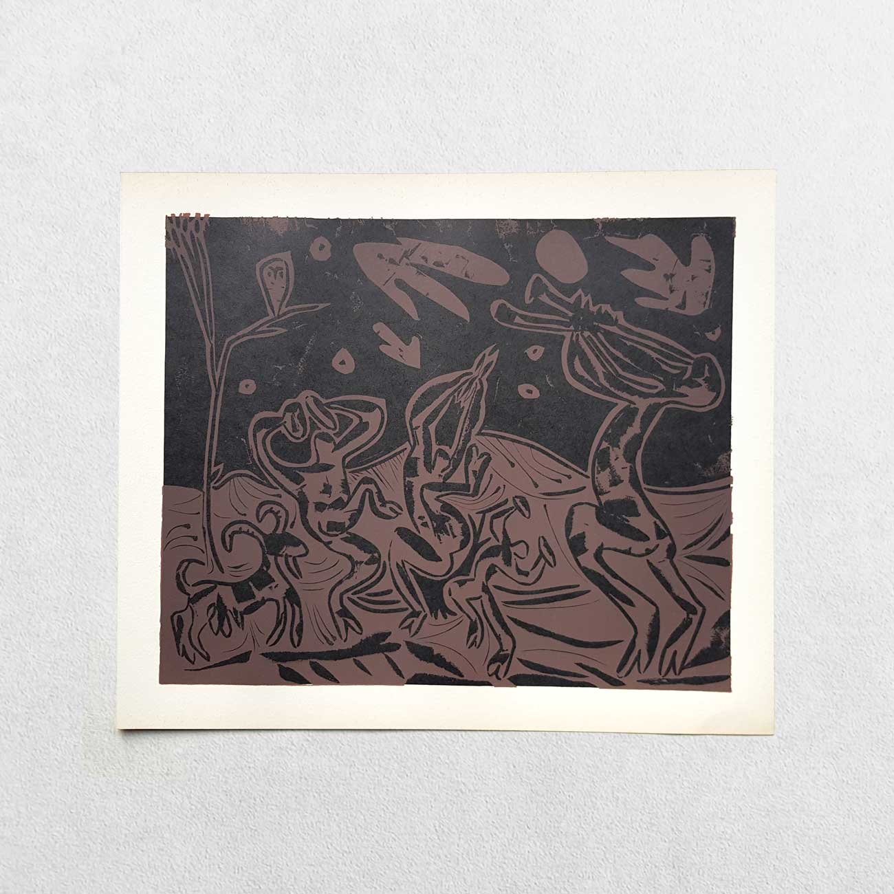 Publisher: Editions Cercle D’Art, Paris, France. Date: 1962. First edition. Printed in Germany. Linocut size: H: 26.8cm W: 32.4cm. Sheet size: H: 31.7cm W: 37.4cm. Original linocut after and approved by Picasso for ‘Picasso Linogravures”, 1962. These linocuts were first issued in signed editions of fifty by Galerie Louise Leiris and printed by Arnéra. Because of the “reduction” method invented and used by Picasso, which uses just one plate of linoleum instead of a separate one for each colour, it was impossible to make any more prints from the original plates. Therefore, in collaboration with Picasso and Galerie Louise Leiris, new linoleum plates were made at 42% of the original size, and it was from these that the above prints were made. Ref: Bloch 909. (Later editions of this work, the editions of 1988 and 2020, were digitally copied without any impression marks, used lesser quality inks, on inferior paper and greatly reduced in quality.) This is a genuine linocut, dating from 1962 on heavy stock paper. Condition: Strong impression mark. Very faint foxing to the margins else a fine, tight, bright, clean copy. Scarce.