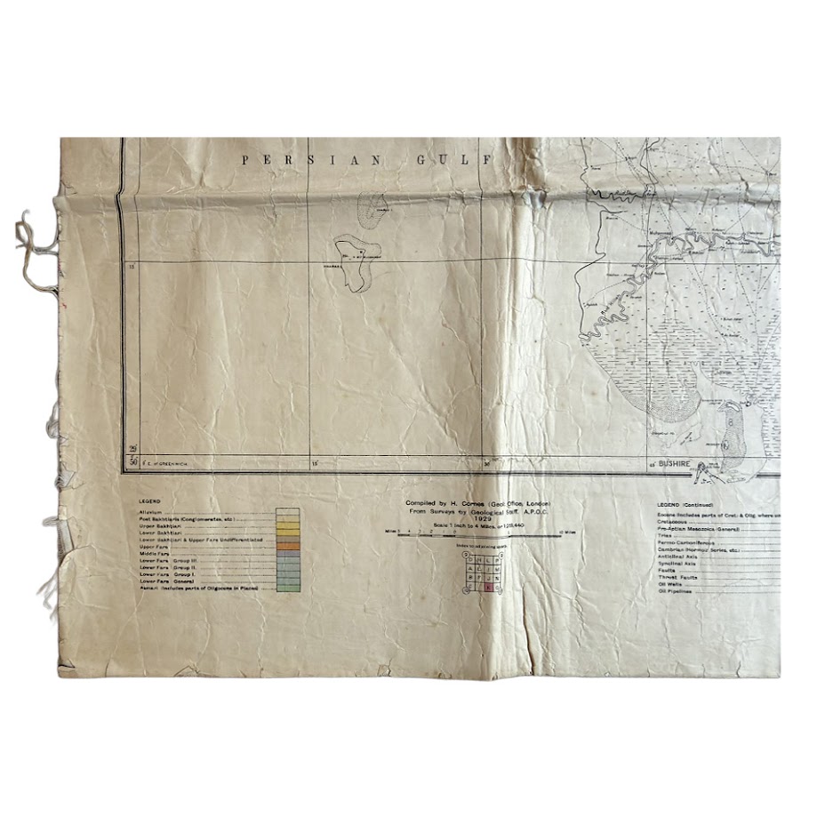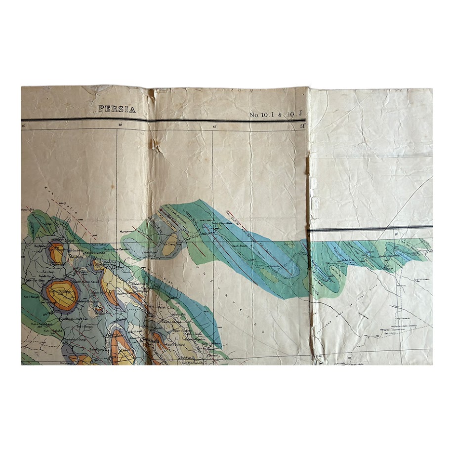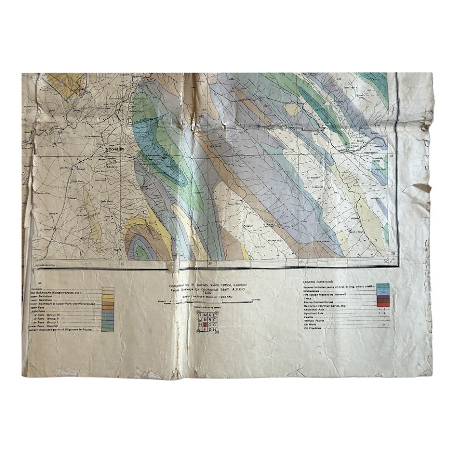 This firmly places the map within the formal geological apparatus of the Anglo-Persian Oil Company. It is a corporate technical document, not a later derivative or educational simplification. The London Geological Office attribution suggests that field surveys carried out in Iran were being synthesised centrally into standardised printed working sheets.