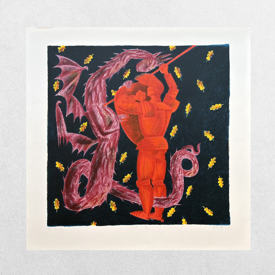Size: 55.5cm x 55.5cm. The sixth in the series that Clive Hicks-Jenkins based on Simon Armitage’s retelling of the anonymous 14th Century folk tale. Unique copy. In fine condition. Signed and inscribed in pencil by the artist ‘For Sarah’. ‘Sarah’ was the late Sarah Parvin and the prints inscribed to her personally by Clive Hicks-Jenkins are arguably the most important copies extant for two reasons: Firstly, the contemporaneous record indicates that the ‘Sir Gawain and the Green Knight’ project was Sarah Parvin’s idea in the first place and secondly because there is compelling evidence that it was Sarah Parvin who made it happen. Please contact us for more information. PRICE INCLUDES FREE ROYAL MAIL SPECIAL DELIVERY POSTAGE IN THE UK.