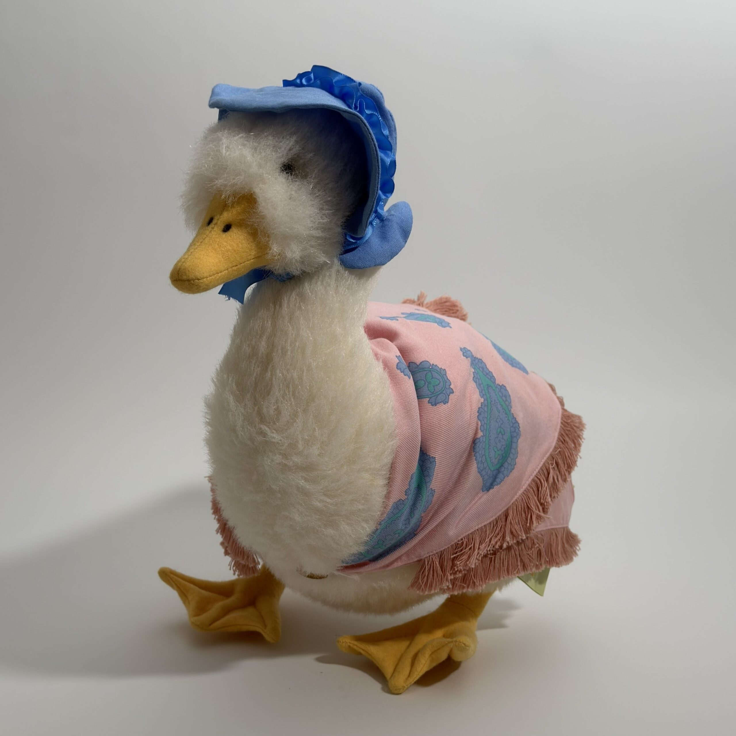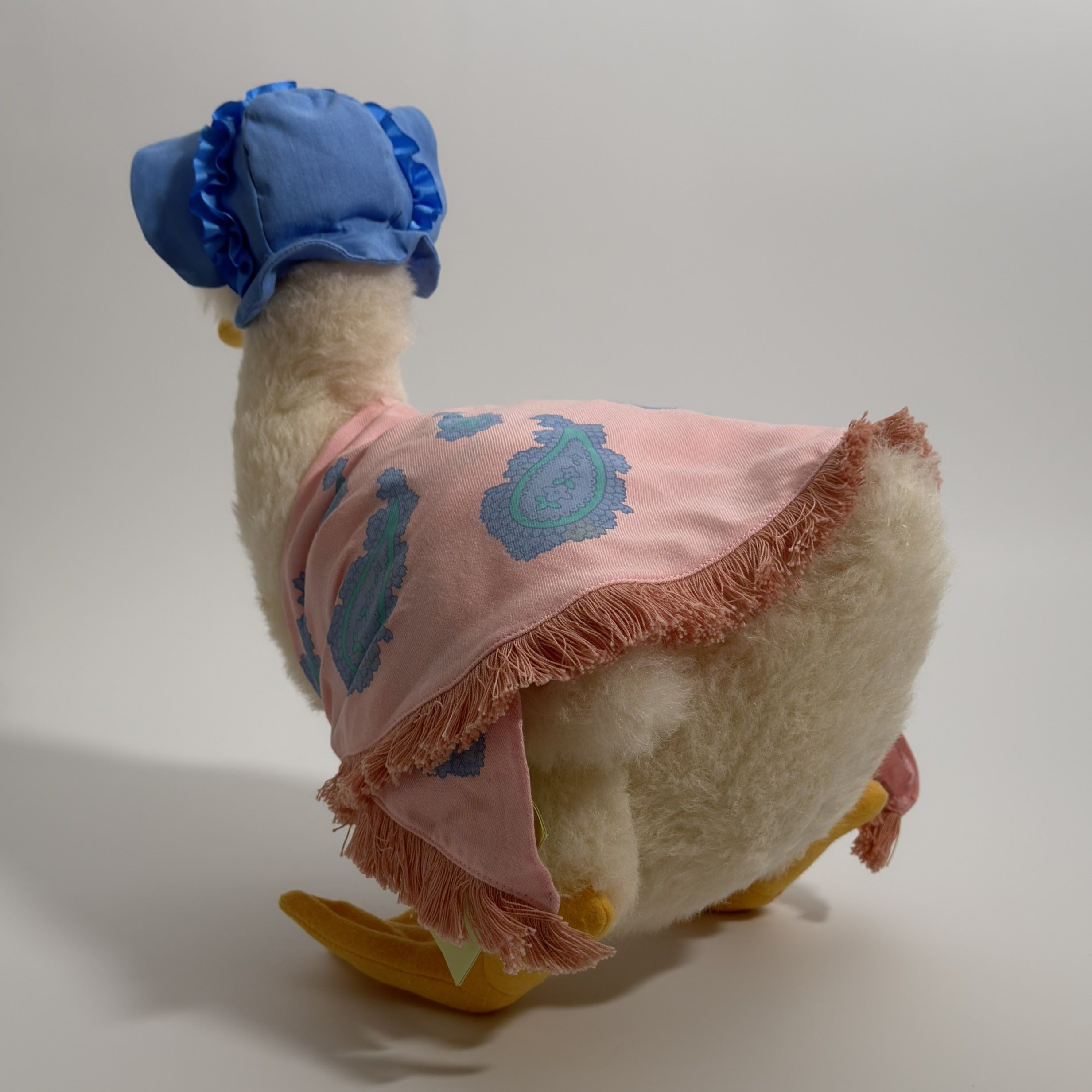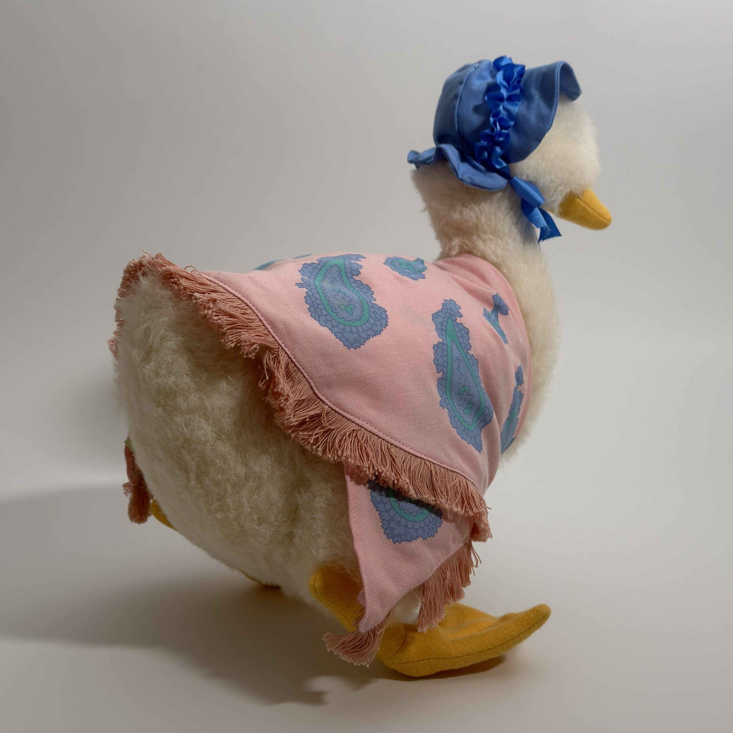 The detailing is notably meticulous: the beak and feet are rendered in a warm golden-yellow textile, carefully shaped to suggest anatomical realism while remaining harmonious with the toy’s overall aesthetic. Jemima’s outfit—a soft pink cape adorned with a paisley motif in muted blues and greens—is trimmed with delicate fringe, introducing both visual depth and a sense of movement. The accompanying bonnet, in a complementary shade of blue, is fashioned with gentle gathers and ties, framing the face and enhancing the character’s recognisable silhouette. Each seam, stitch, and applied element demonstrates a high level of hand-finishing, characteristic of Steiff’s workshop standards, where precision and longevity are paramount. The surface-washable finish also reflects a practical consideration, allowing for careful maintenance without compromising the integrity of the materials.