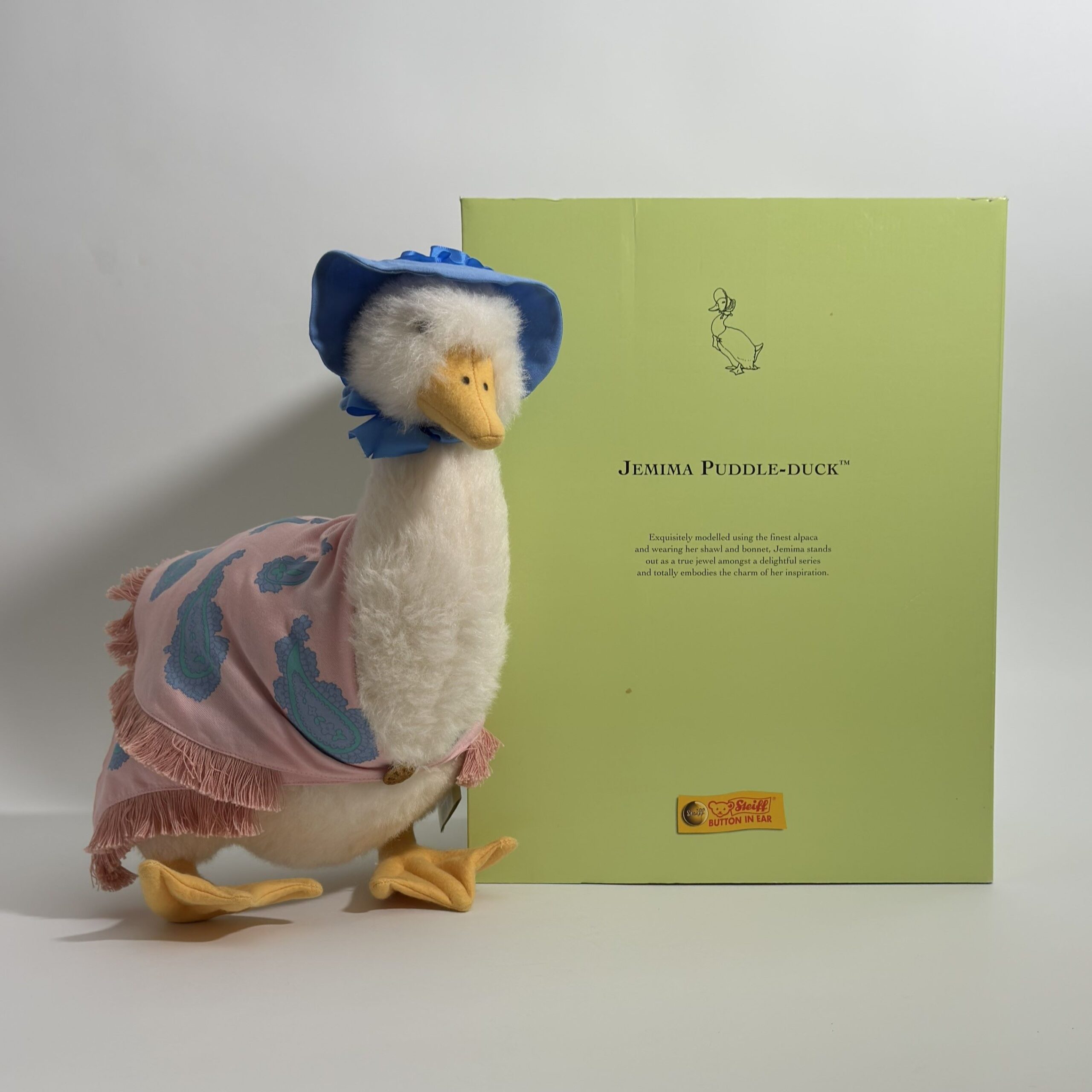 From the Beatrix Potter Collection of Thomas and Greta Schuster. This item is in fine condition with its original Steiff box and certificate (attached to her wing). There are some marks on the label, please see photographs. There is some wear to the box, but very good condition overall. Jemima Puddle-Duck is non-jointed, she can either sit or stand. Please contact us for more details if required.