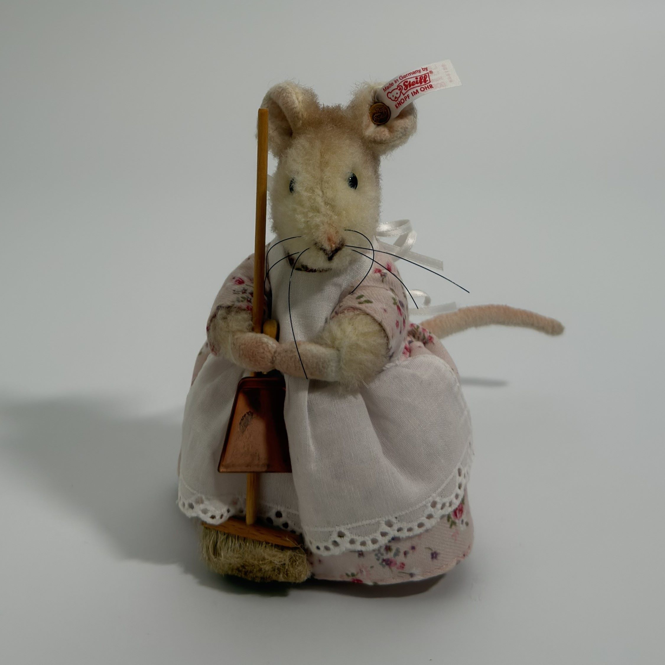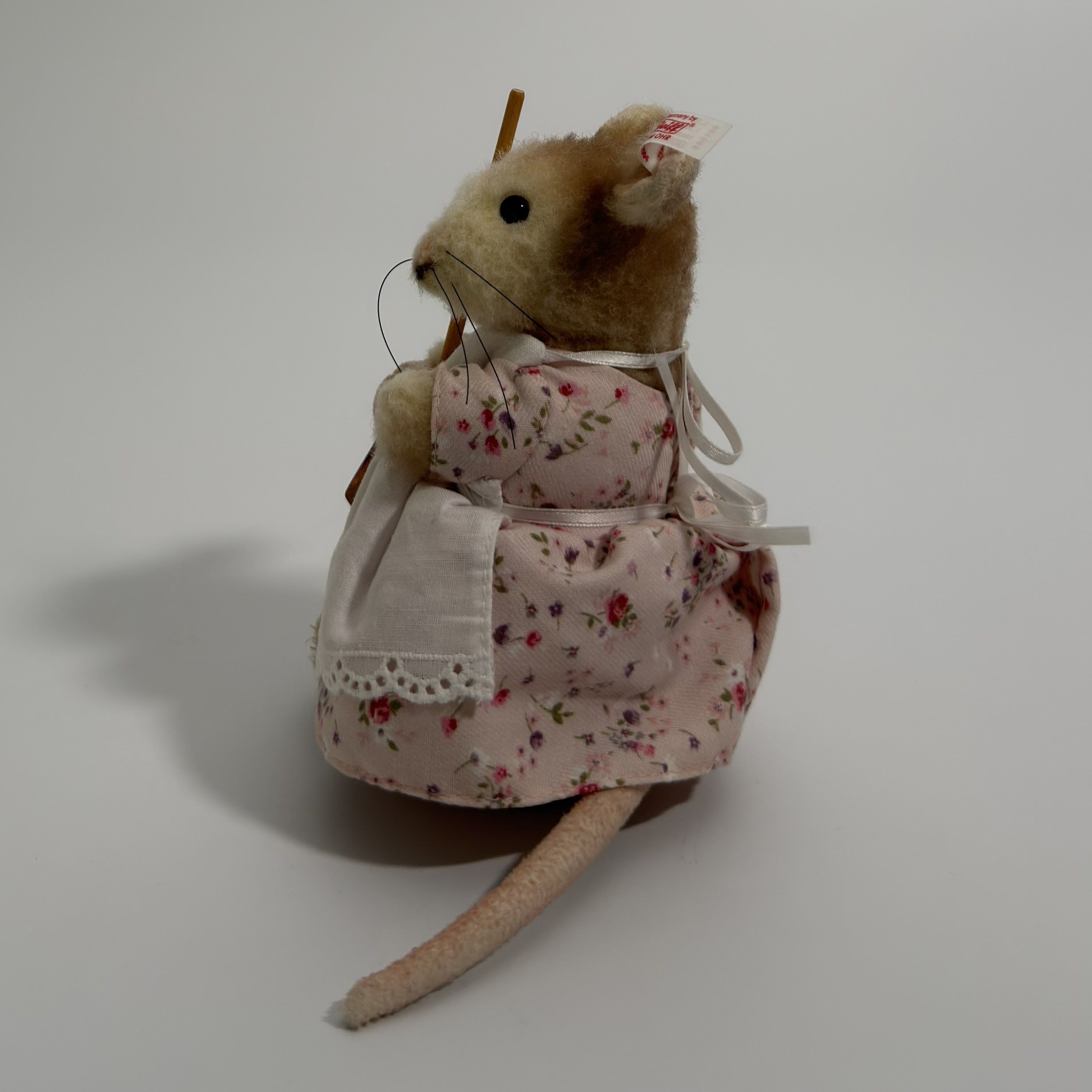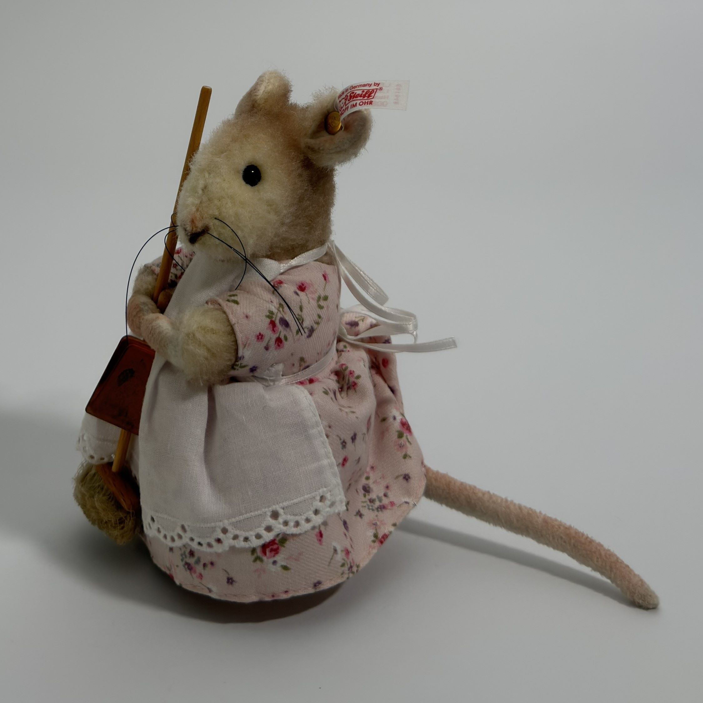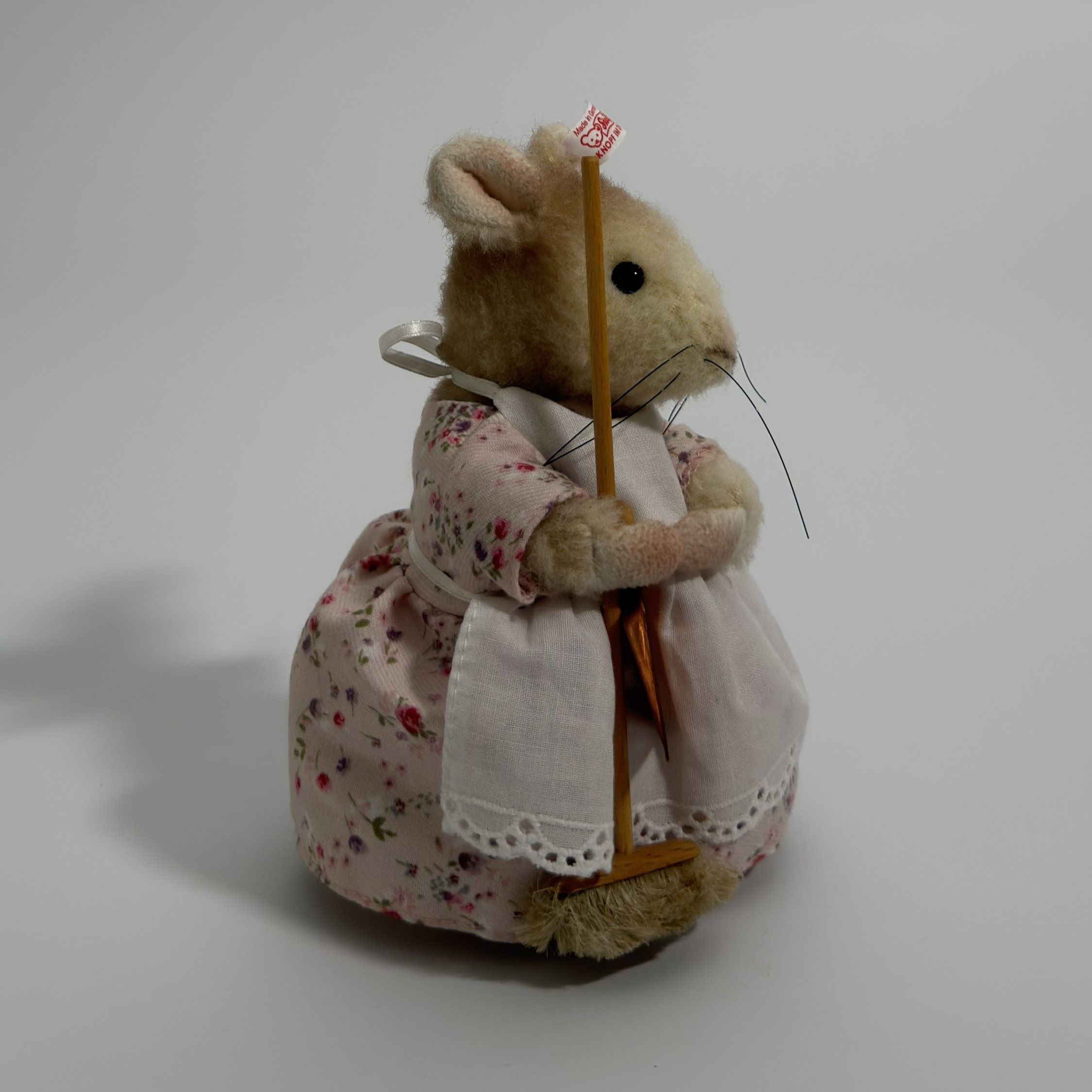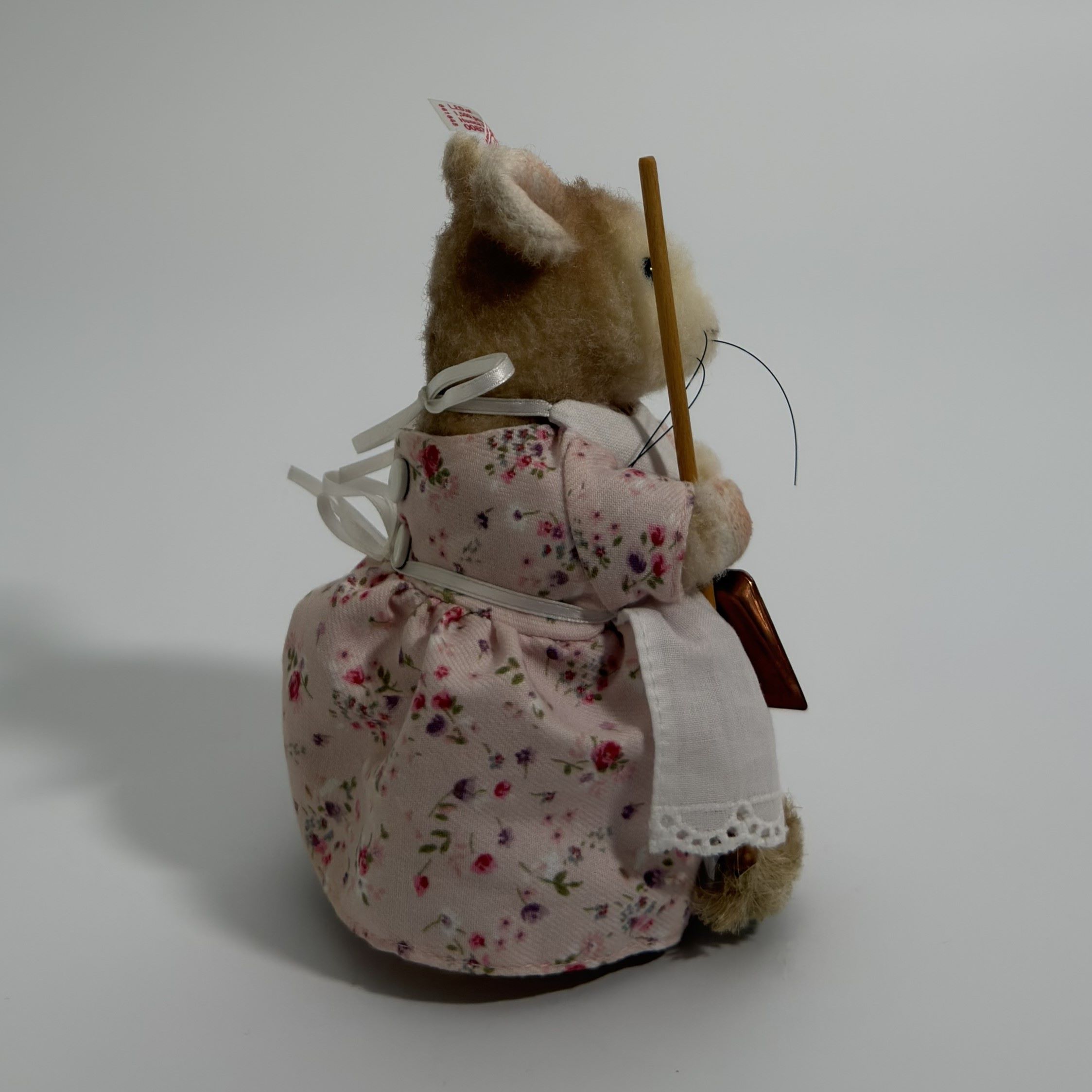 Hunca Munca is crafted from high-quality alpaca, a material valued for its soft handle and refined finish, lending the figure a delicate and slightly matte appearance. The filling consists of acrylic fibre, ensuring a stable structure while maintaining a pleasing softness. The mouse’s features are carefully rendered, with subtle shaping to the muzzle, neatly applied whiskers, and small, dark eyes that provide a lifelike focal point. Particular attention has been given to the costume: the floral fabric dress, lace-trimmed apron, and neatly tied ribbon at the back demonstrate precision in textile work at miniature scale. The broom accessory, complete with a wooden handle and bristled base, adds dimensional interest and reinforces the narrative theme. Overall, the piece reflects disciplined hand-finishing and a high standard of assembly.