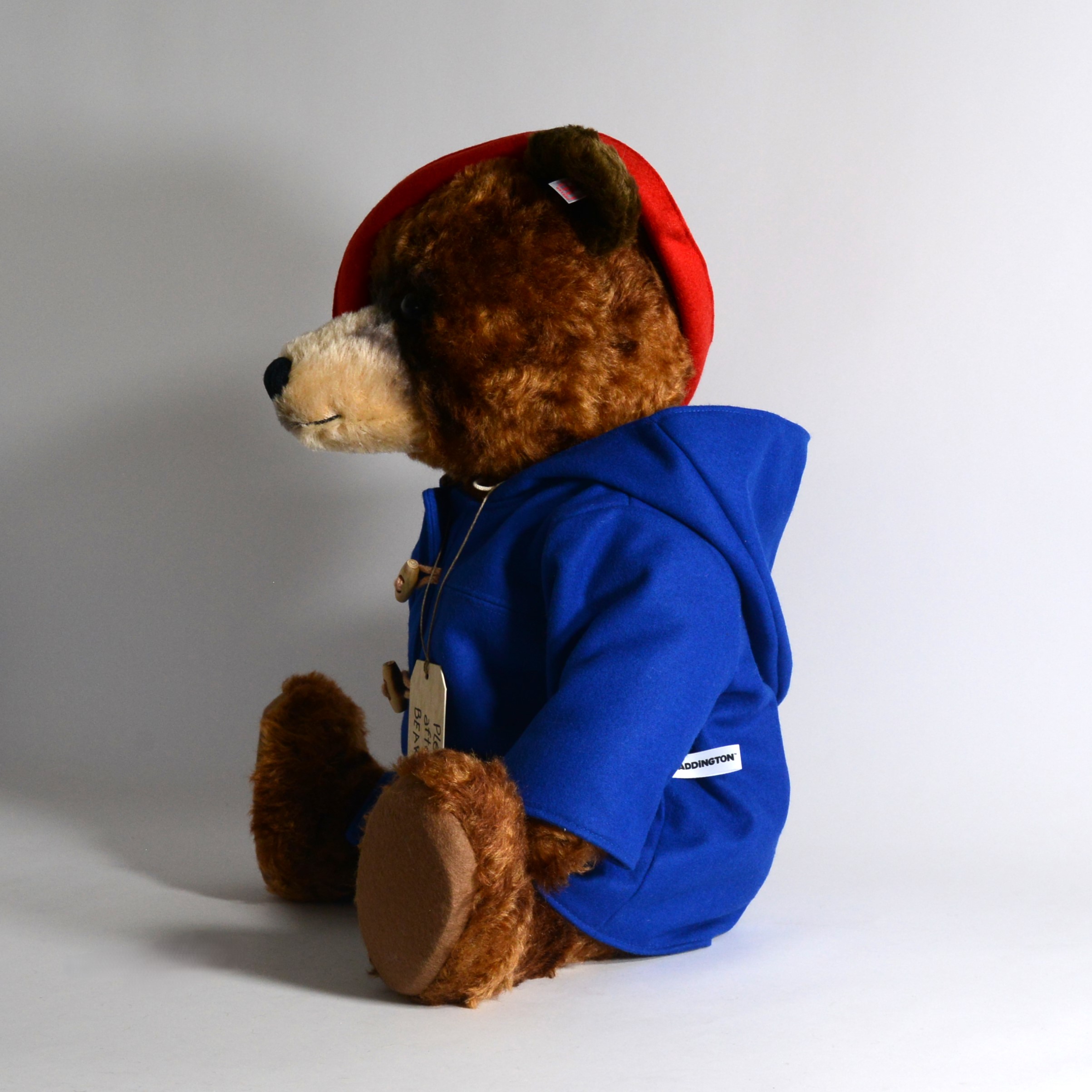 Paddington’s face is a masterpiece of character and craftsmanship. His eyes are made of glossy black glass, carefully positioned to capture a sense of warmth and curiosity that reflects his adventurous nature. A neatly hand-stitched nose and gently contoured muzzle complete his expressive visage, enhanced by delicate airbrushing around his eyes and mouth for a lifelike finish. True to his classic look, this Paddington is dressed in a meticulously detailed outfit. He wears a navy blue duffle coat, complete with authentic-style wooden toggles. The coat is tailored to fit his proportions perfectly, with deep front pockets – ideal for storing a marmalade sandwich or two. On his head sits a broad-brimmed red felt hat, crafted in the traditional floppy style that fans will immediately recognise. The hat is securely sewn in place and tilted slightly forward, giving him a perpetually inquisitive expression. Around his neck hangs his signature luggage tag, made from aged-effect card and inscribed in classic script: “Please look after this bear. Thank you.” This small detail perfectly encapsulates the spirit of Michael Bond’s original creation.
