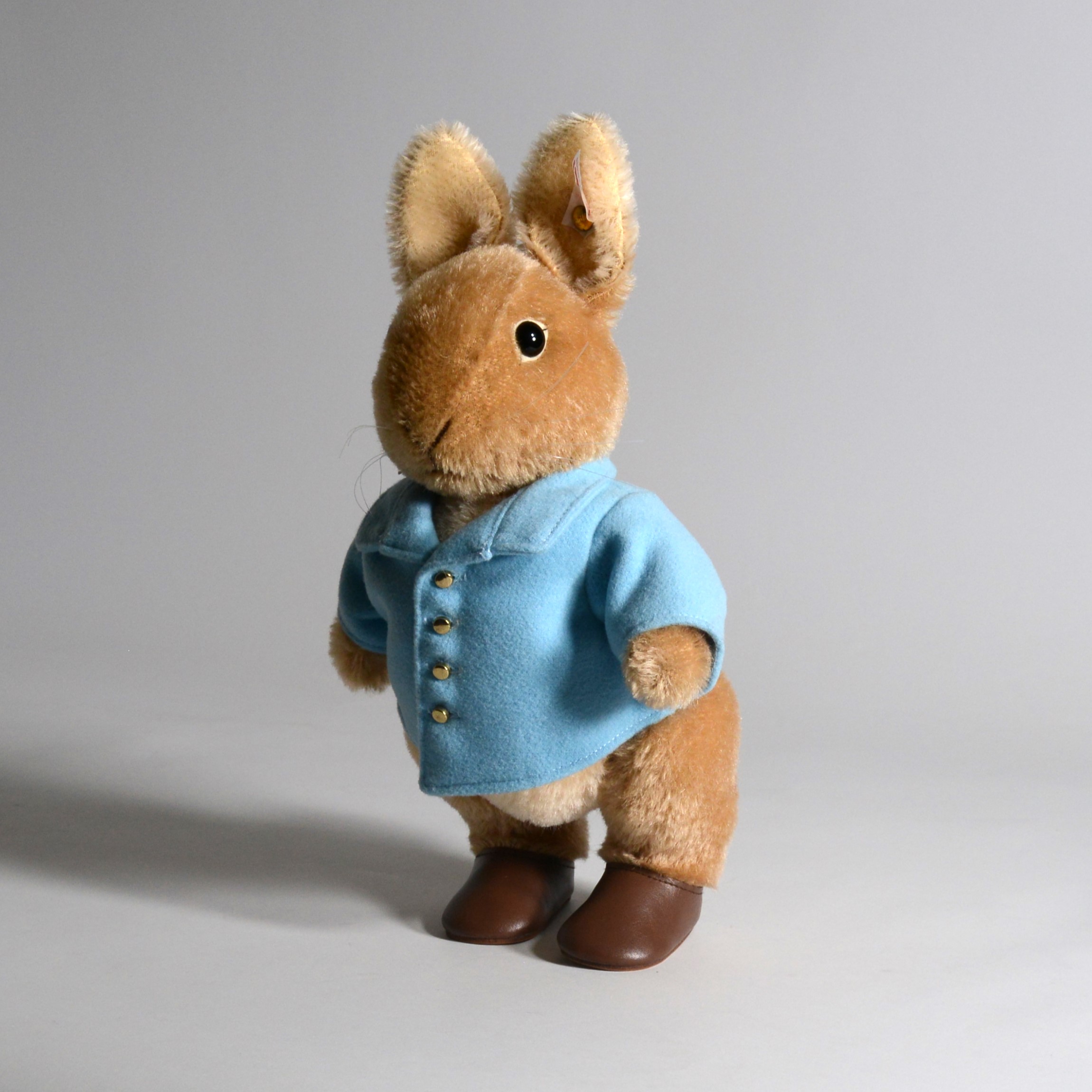 Peter’s facial features are delicately rendered, with shiny black safety eyes that sparkle with mischief and a soft, hand-stitched nose in brown thread. His long, sculpted ears—one playfully leaning to the side—evoke his impish, inquisitive nature. Standing at 26 cm tall, Peter is dressed in his signature blue jacket, made from rich, sky-blue felt and tailored with exquisite detail. The jacket features neat cuffs and tiny gold buttons, echoing the Edwardian aesthetic of Potter’s illustrations. The coats’ structure and fit convey movement, as though it is caught mid-scamper, billowing behind him as he rushes through Mr McGregor’s garden.