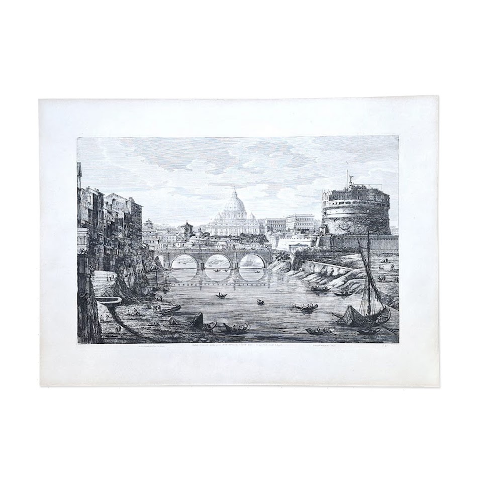 VEDUTA GENERALE DELLA GRAN MOLE ADRIANA E PONTE ELIO – HADRIAN’S MAUSOLEUM AND THE AELIAN BRIDGE – ORIGINAL ETCHING WITH ENGRAVING BY LUIGI ROSSINI