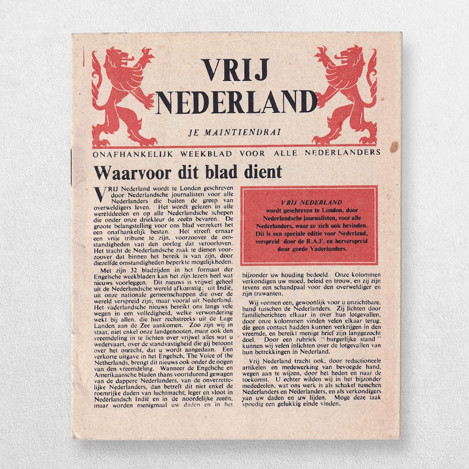 Vrij Nederland was born during the darkest days of the German occupation of the Netherlands in the Second World War. Its roots lay in the Dutch resistance movement, where underground periodicals were an essential means of spreading independent information, countering Nazi propaganda, and sustaining national morale. First appearing in 1940, it was produced clandestinely and distributed at great personal risk. The paper took its title, which translates as “Free Netherlands”, as a direct expression of defiance and hope for liberation.