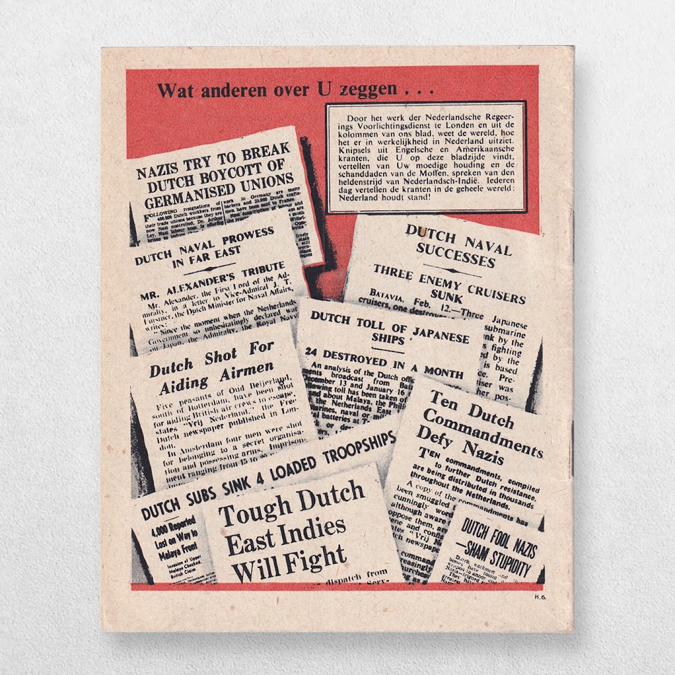 The addition of the motto Je Maintiendrai (“I will maintain”), the traditional Dutch national motto with origins in the House of Orange-Nassau, underscored the publication’s commitment to endurance and sovereignty. It symbolised resistance not only to the occupiers but also to the erosion of democratic values. In the context of the underground press, this motto served as a rallying cry, reminding readers of continuity with the Dutch state and its constitutional monarchy, even while official institutions were suppressed.